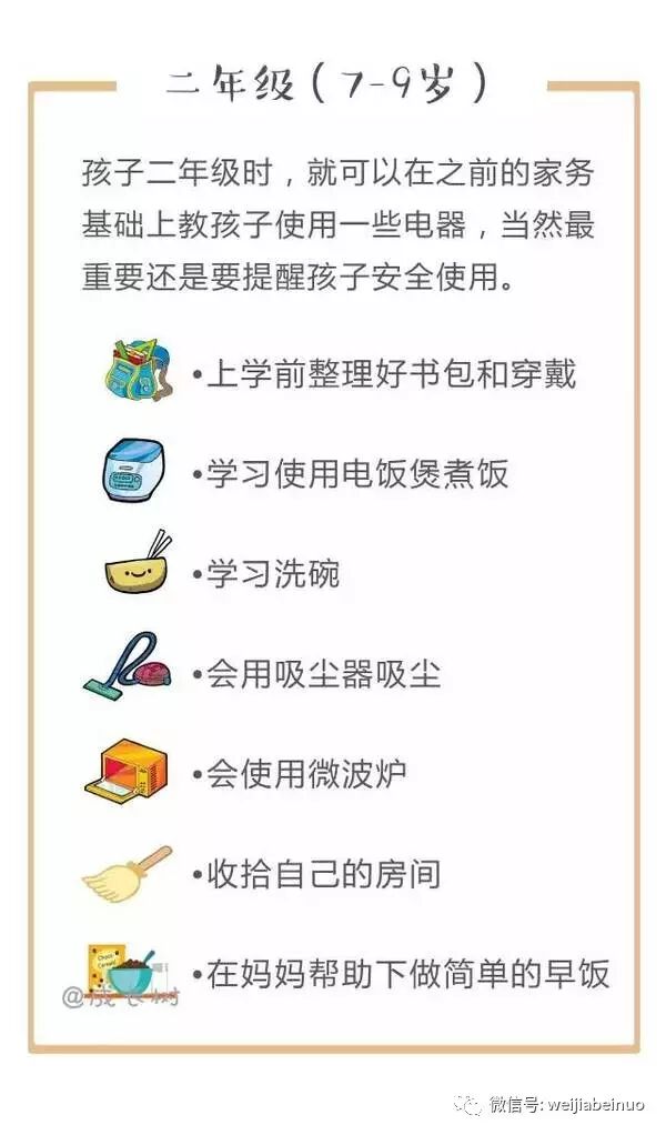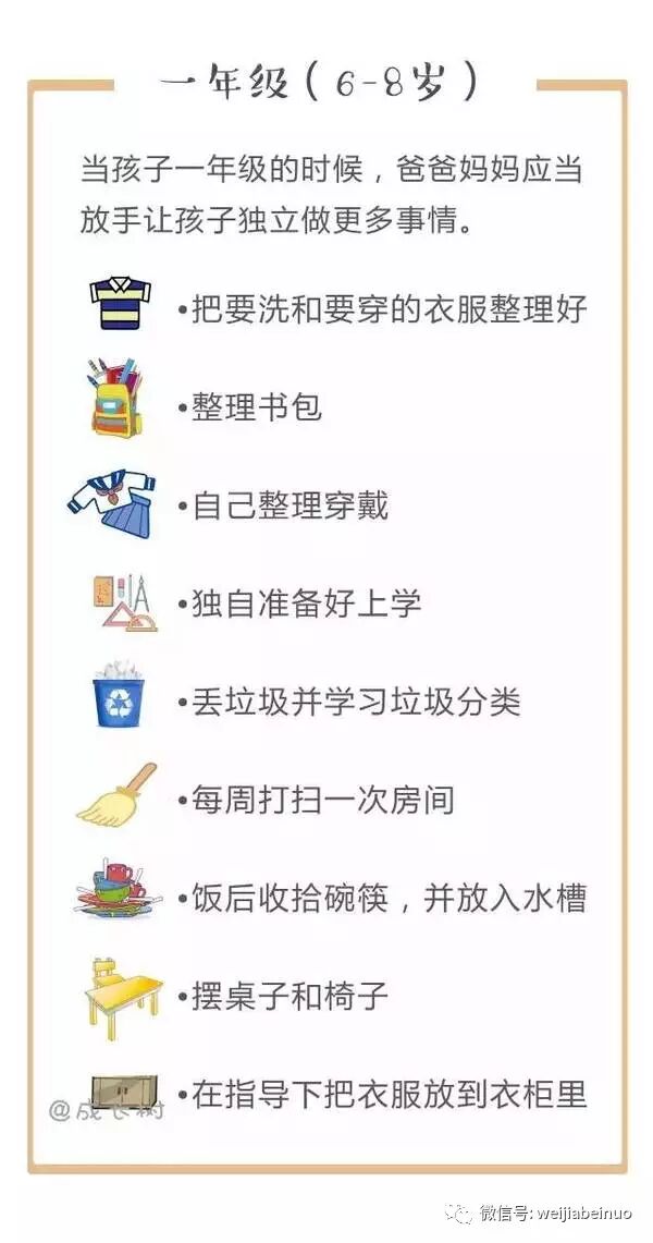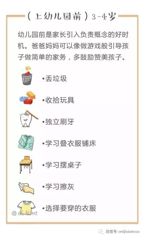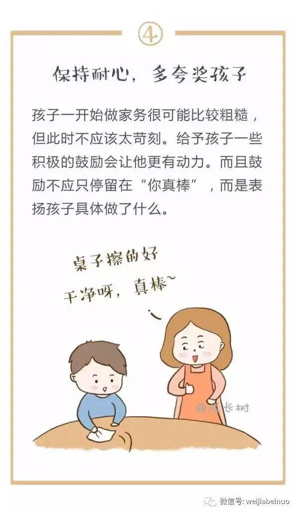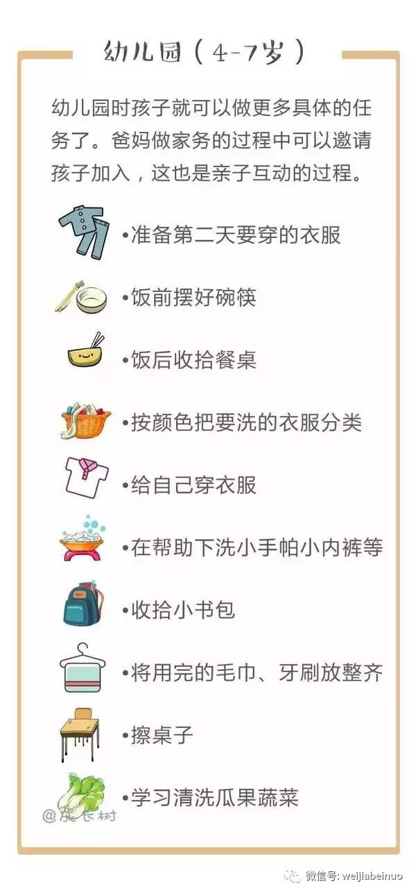 其实从孩子3岁开始,妈妈们就可以有意识地培养孩子做家务了。对照下面的家务年龄表,妈妈们可以更好地把握什么年龄的孩子该做哪些家务。